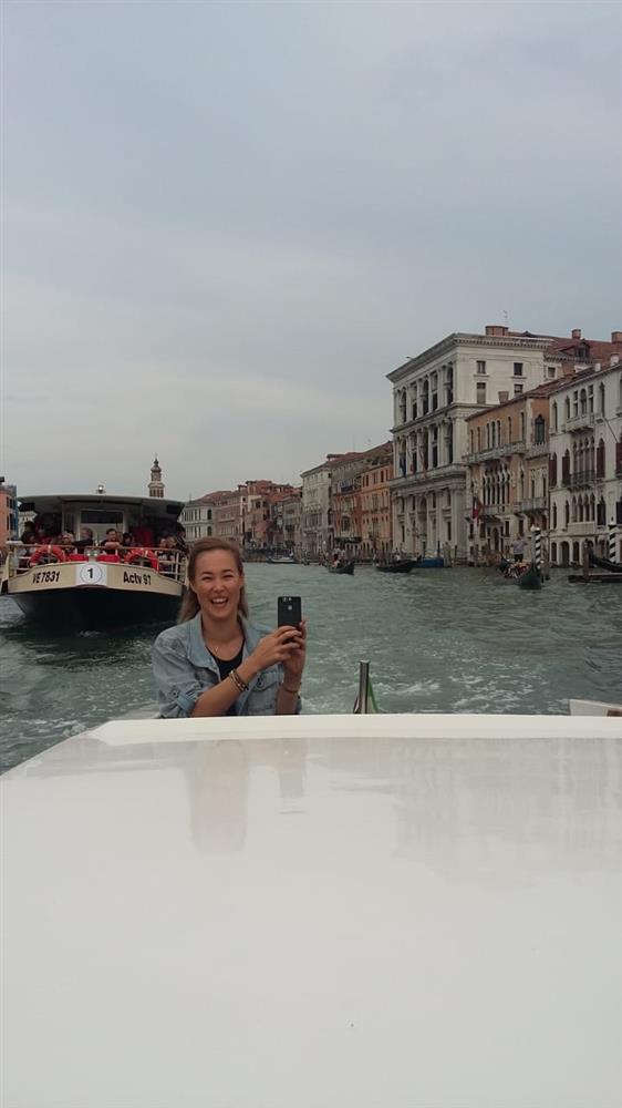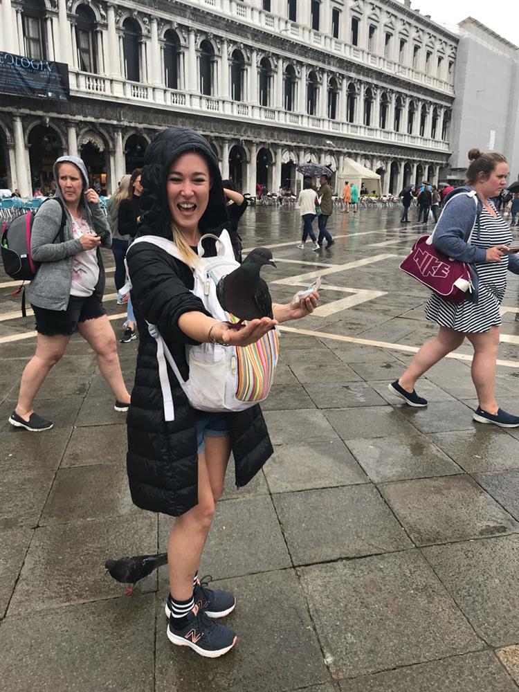 Have a look at Jen’s Italian travels below… We love this little dove biscuit! Just look at her standing below next to that giant monster … and on a boat .. and with a bird and met a wynie and a crew..