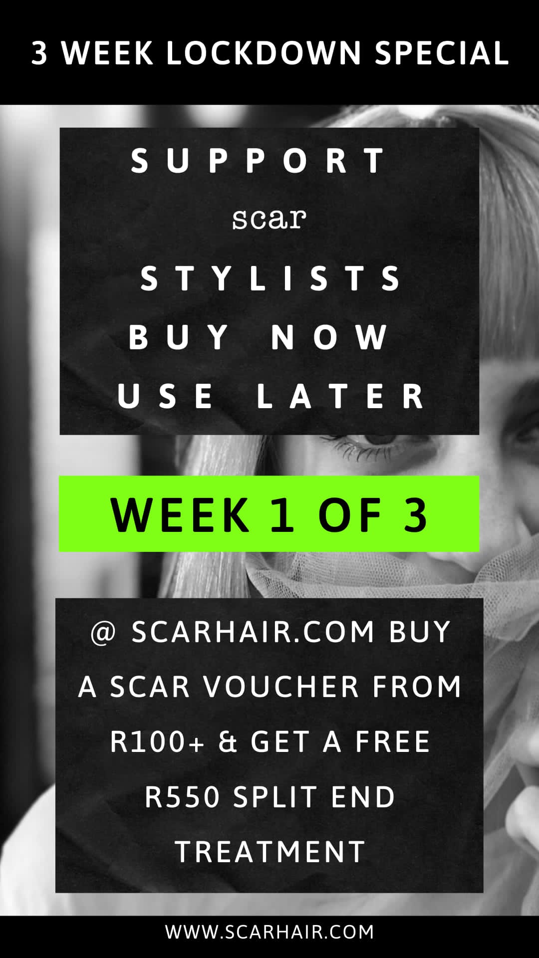When the lockdown is over, you can redeem the voucher(s) and we at scar will throw in a R550 Brazilian Blowout Split Ends Treatment FOR FREE – FOR YOU !
